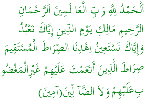 我从受驱逐的魔鬼上求主护佑,奉普慈特慈的真主之名,赞颂全归真主,全世界的主,普慈特慈的主,我们只崇拜你,只求你佑助,求你引导我们上正路,你所佑助者的路,不是受遣怒者的路,也不是迷误者的路。主啊!你准承我们的祈求吧! |