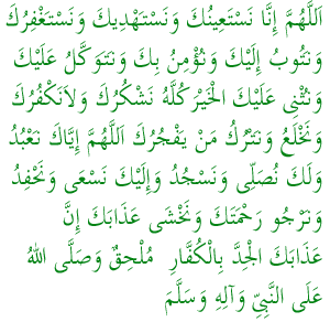 主啊!我求你襄助,求你饶恕。我们归信你,我们依靠你,我们以美好赞颂你,我们感谢你,不辜负你,我们脱离你不喜悦的,我们远离你的罪犯。主啊!我们只崇拜你,只为你而礼拜、叩头。我们只为你而奔波,我们指望你的慈悯,害怕你的罪刑,你的罪刑确是加于不信你的人上。 |