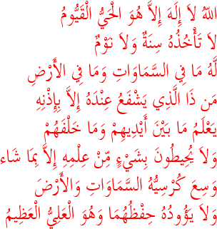 真主,除了他外,绝无应受崇拜的、他是永生不灭的,是维护万物的。瞌睡不能侵犯他,睡眠不能克服他,天地万物都是他的,不经他的许可,谁能在他那里说情呢?他知道他们前面的事,和他们身后的事。除他所启示的外,他们绝不能窥测他的玄妙。他的知觉包罗天地,天地的维持不能使他疲倦。他确是至尊的,确是至大的。 |