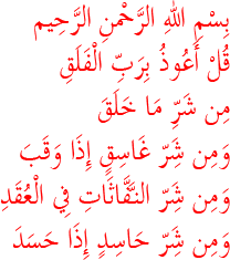你说:我求庇于曙光的主,免遭他所创造者的毒害;免遭黑夜笼罩时的毒害;免遭吹破坚决的主意者的毒害;免遭嫉妒时的毒害。 |