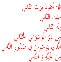 你说:我求庇于世人的主宰,世人的君王,世人的神明,免遭潜伏的教唆者的毒害,他在世人的胸中教唆,他是属于精灵和人类的。。 |