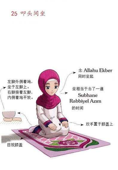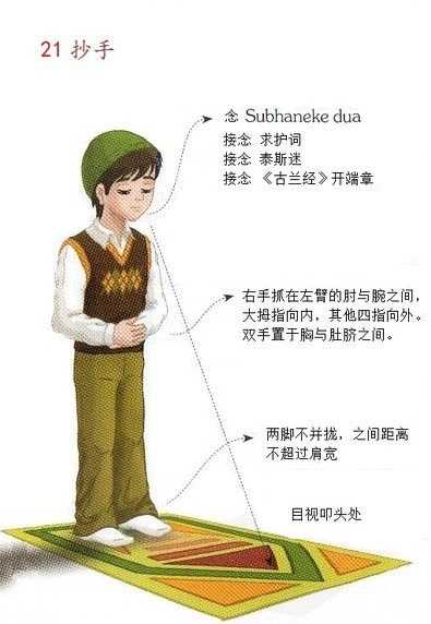 如果是四拜主命拜的话,除举意不同外,前两拜的做法一模一样直到中座,只是后两拜抄手中,在念完《法提哈》后 以下↓的《古兰》章节就不用念直接鞠躬。 |