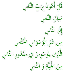 你说 :我求庇于世人的主宰 ,世人的君王 ,世人的神明 ,免遭潜伏的教唆者的毒害 ,他在世人的胸中教唆 ,他是属于精灵和人类的。 |